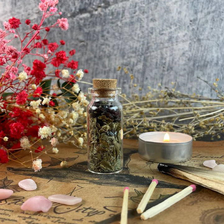 Відьмина пляшка на захист — це потужний інструмент магії, створений з природних компонентів і символів захисту. До складу входять кирказон, барбарис і чорний камінь — кожен елемент підсилює енергію опору злу і допомагає сформувати навколо вас енергетичний щит.