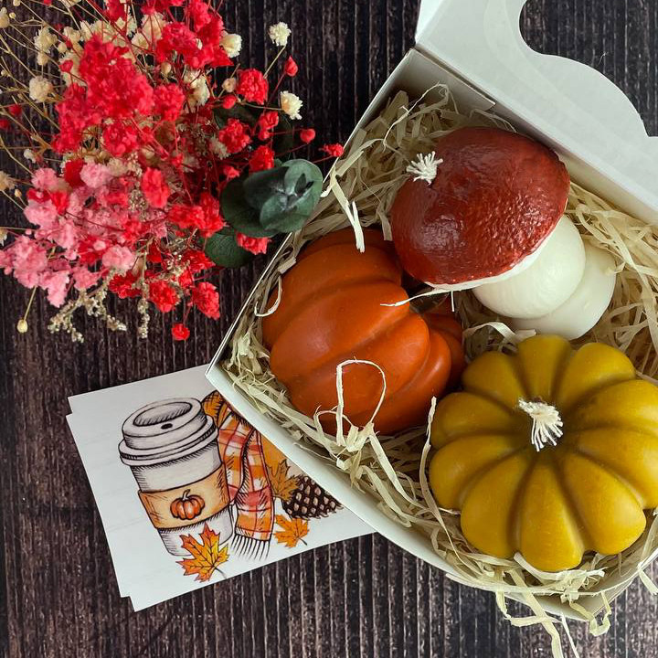 Осінній набір свічок — декоративні воскові свічки ручної роботи у вигляді гарбуза та гриба.